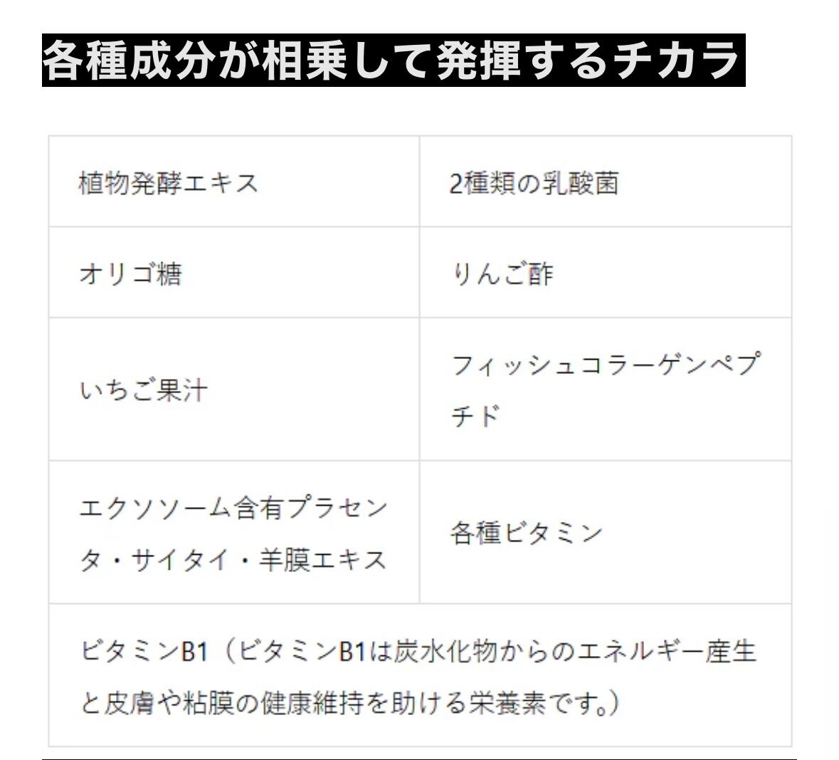 イソマルトオリゴ糖液糖(国内製造)、りんご酢、植物発酵エキス、フラクトオリゴ糖液糖、りんご果汁、いちご果汁、乳酸菌末(殺菌)、フィッシュコラーゲンペプチド、エクソソーム含有プラセンタ・サイタイ・羊膜エキス/酸味料、香料、甘味料(ステビア)、ビタミンB1、ビタミンC、ビタミンB2、ビタミンB6、ビタミンE、ビタミンA、ビタミンB12、(一部にキウイフルーツ・大豆・もも・りんご・ゼラチンを含む)