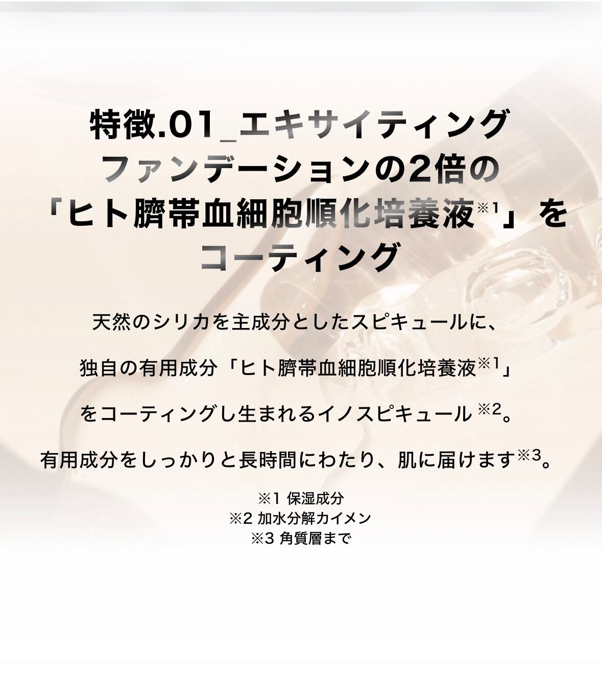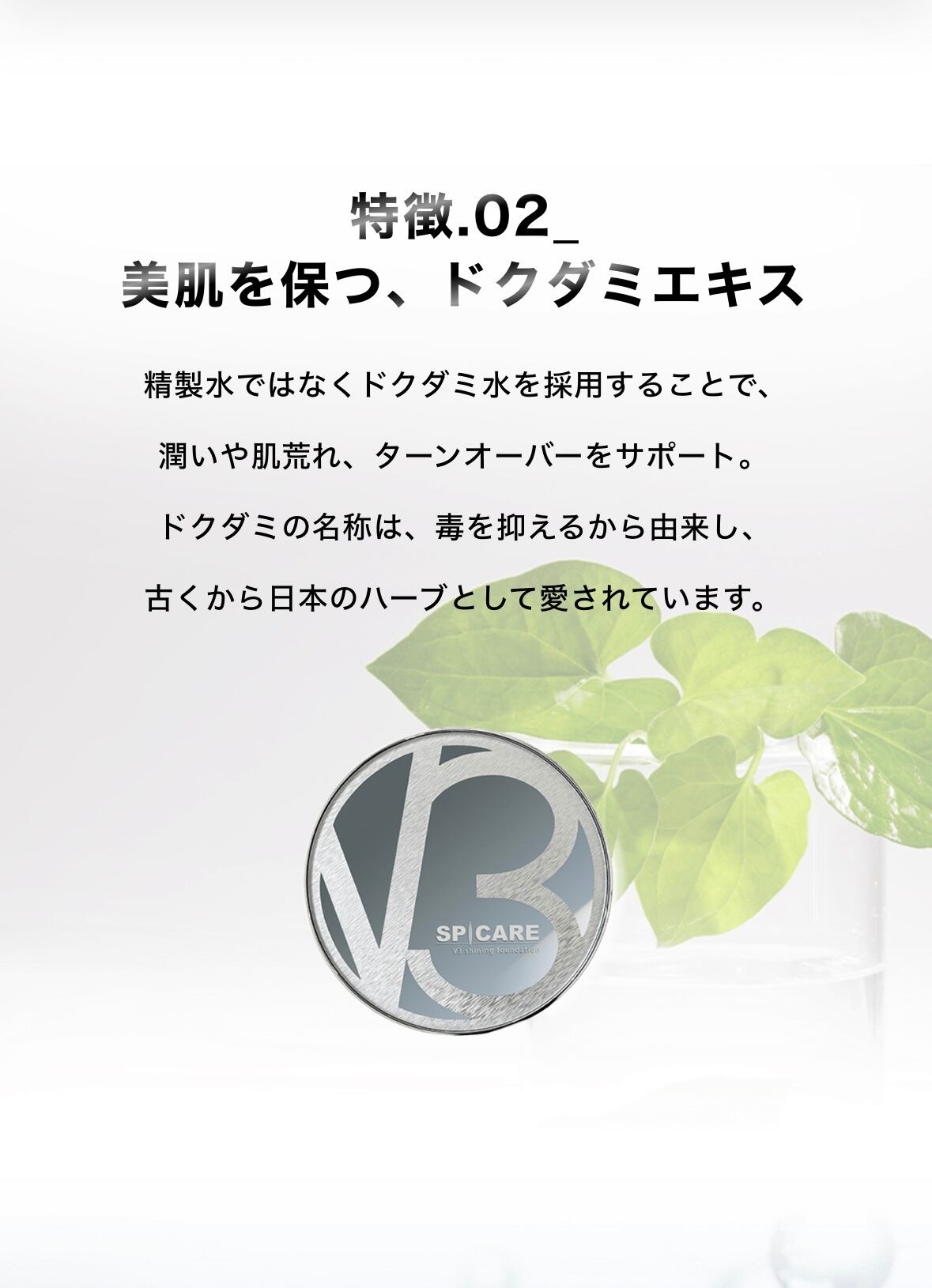 大人気の「V3エキサイティングファンデーション」の長所はそのままに、新たな美容成分を追加した「イノスピキュール」を筆頭に、「ドクダミエキス」「アディポゾール」「タンニンコンプレックス」「ナチュラルSW」などの成分が、元気に、美しく、自信の溢れるお肌に導きます。