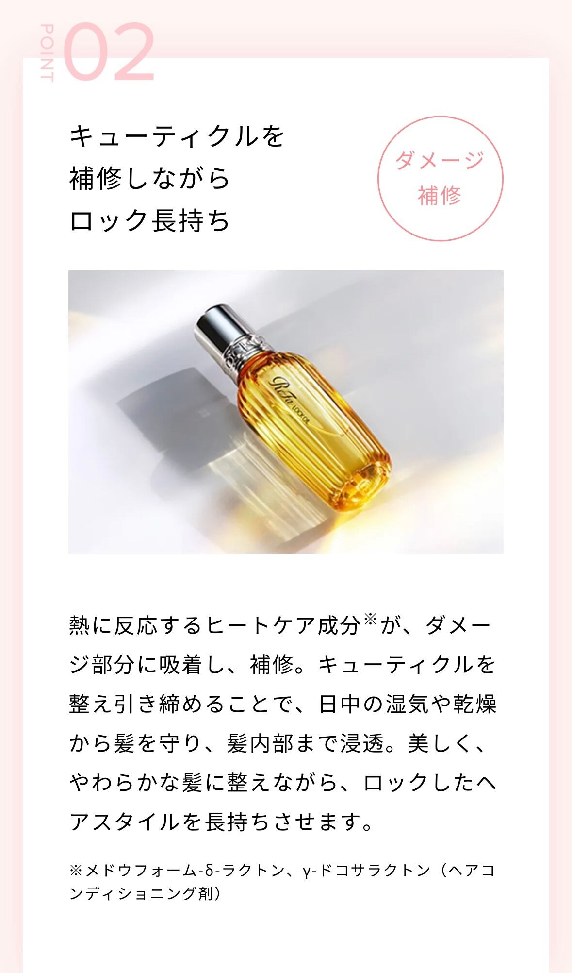 熱を味方に美しくロックし、理想のスタイルがつづくオイルです。カールもストレートも、崩さずに保ちたい。ツヤも指どおりも、思い描いたままに叶えたい。そんなスタイリングのお悩みに、アイロン前のワンステップ。プロフェッショナルの熱コントロールに着想を得た独自の処方で、カールもストレートも、時間がたってもロックをかけたまま。エアリーなニュアンス。