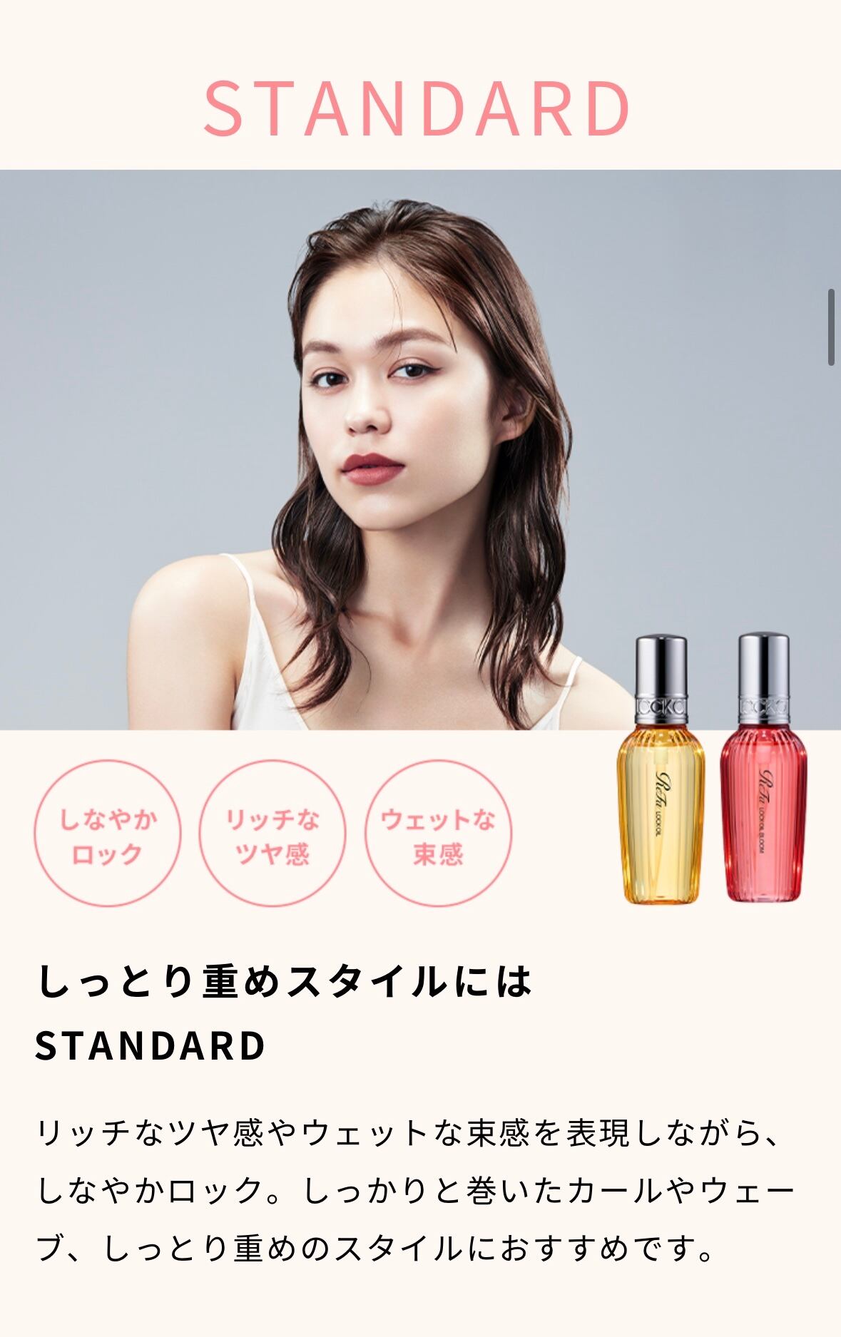 リッチなツヤ感やウェットな束感を表現しながら、しなやかロック。しっかりと巻いたカールやウェーブ、しっとり重めのスタイルにおすすめです。