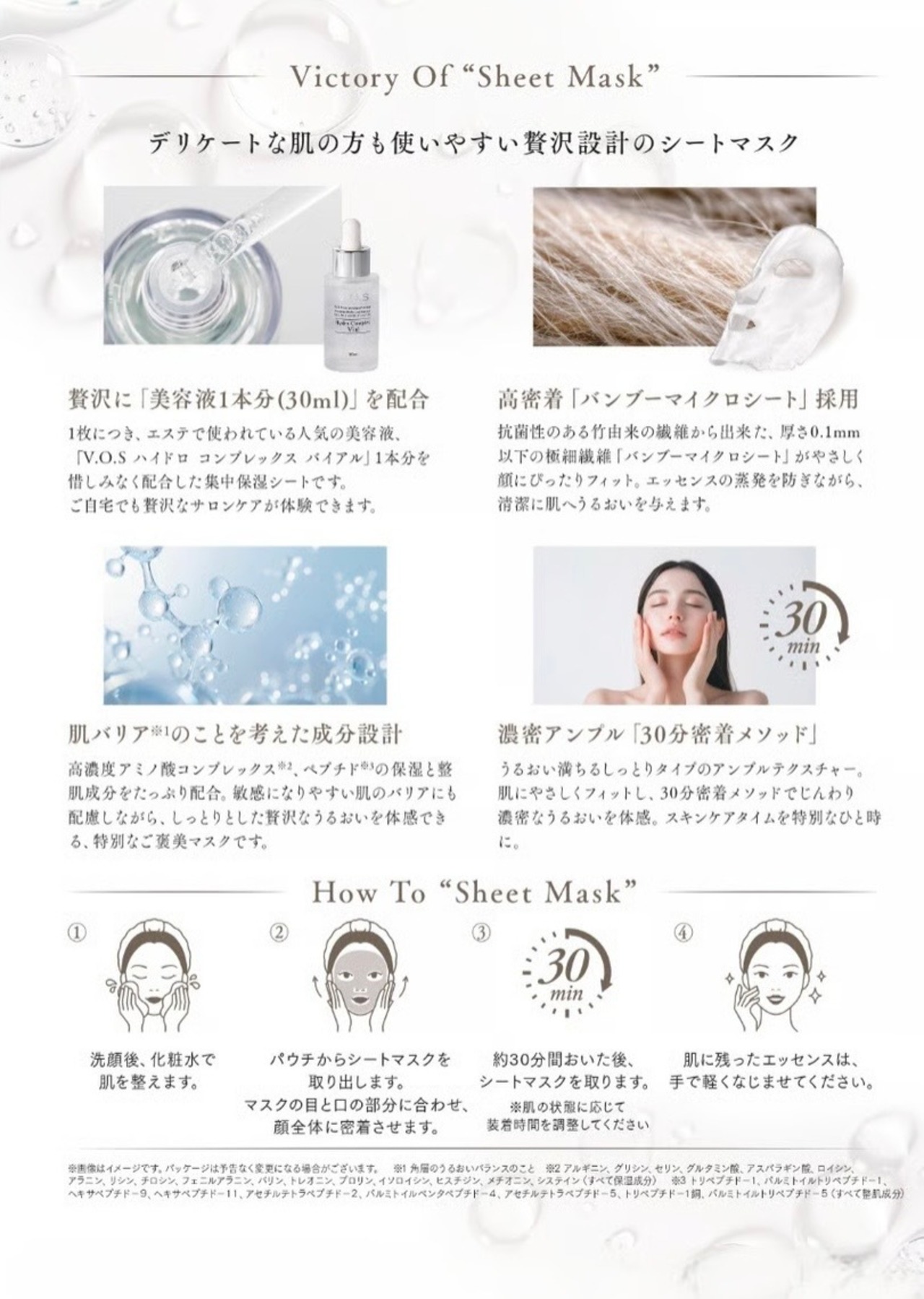 1枚につき、エステで使われている人気の美容液、「V.O.Sハイドロコンプレックス バイアル」1本分を惜しみなく配合した集中保湿シートです。ご自宅でも贅沢なサロンケアが体験できます。