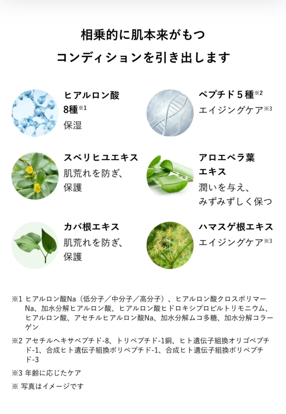 水、プロパンジオール、ヒポファエラムノイデス果実エキス、エチルヘキサン酸セチル、トリ(カプリル酸/カプリン酸)グリセリル、グリセリン、ナイアシンアミド、セテアリルアルコール、ステアリン酸、ステアリン酸ソルビタン、ポリソルベート60、ステアリン酸グリセリル、ジメチコン、BG、ステアリン酸PEG-100、 月見草油、 ハマスゲ根エキス、パンテノール、カプリリルグリコール、ニコチン酸トコフェロール、カルボマー、1,2-ヘキサンジオール、エチルヘキシルグリセリン、アルプチン、トロメタミン、加水分解コラーゲン、香料、 アマニ油、 アデノシン、EDTA-2Na、加水分解カイメン、グルタチオン、ベンジルグリコール、加水分解ムコ多糖、ヒアルロン酸Na、アスコルビン酸、ソルビトール、水添レシチン、テトラヘキシルデカン酸アスコルビル、カバ根エキス、 バルミチン酸レチノール、 ヒアルロン酸クロスポリマー Na 、 スベリヒユエキス、アロエベラ葉エキス、トコフェロール、ピーナッツ油、加水分解ヒアルロン酸、ヒアルロン酸ヒドロキシプロピルトリモニウム、セラミドNP、スクワラン、ヒアルロン酸、シリカ、アセチルヒアルロン酸Na、アセチルヘキサペプチド-8、 トリペプチド-1、 ヒト遺伝子組換オリゴペプチド-1、合成ヒト遺伝子組換ポリペプチド-1、合成ヒト遺伝子組換ポリペプチド-3